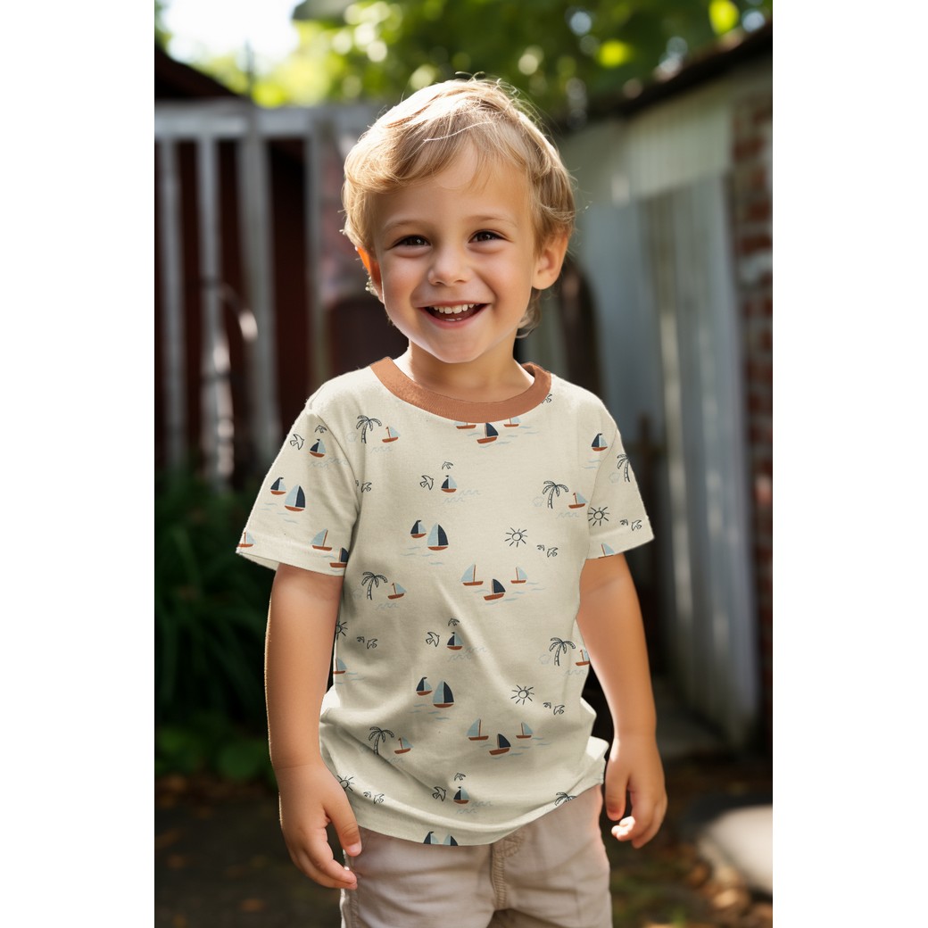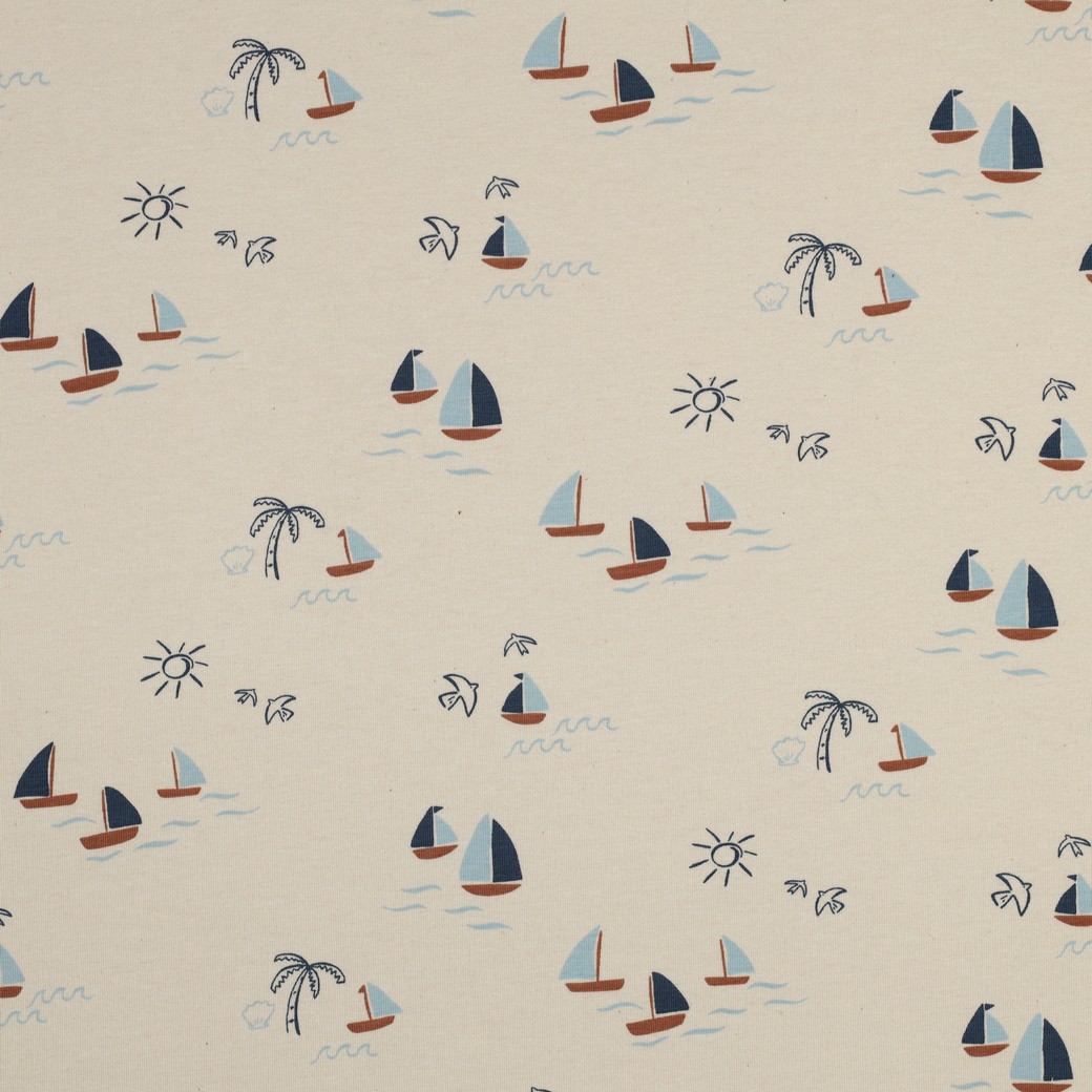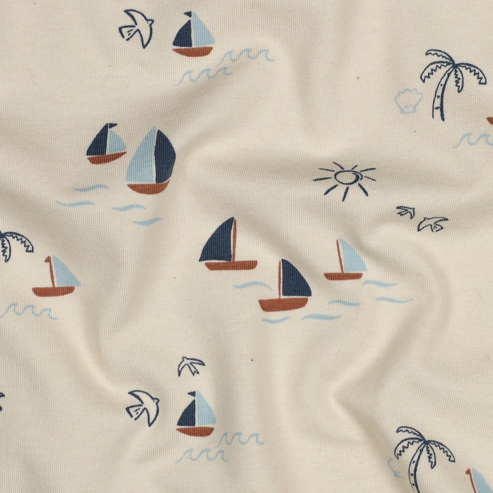 Sommer, Sonne, Meeresluft – dieser Bio Jersey mit Segelbooten bringt Urlaubsfeeling pur! Auf cremefarbenem Hintergrund tummeln sich kleine Boote, Palmen und Möwen in sanften Blau- und Brauntönen. Der weiche, elastische Stoff eignet sich wunderbar für maritime Outfits, Kinderkleidung, Pyjamas oder Accessoires. Ein natürlich schöner Stoff für alle, die das Meer lieben.