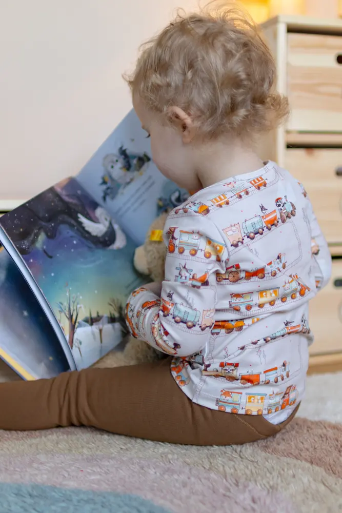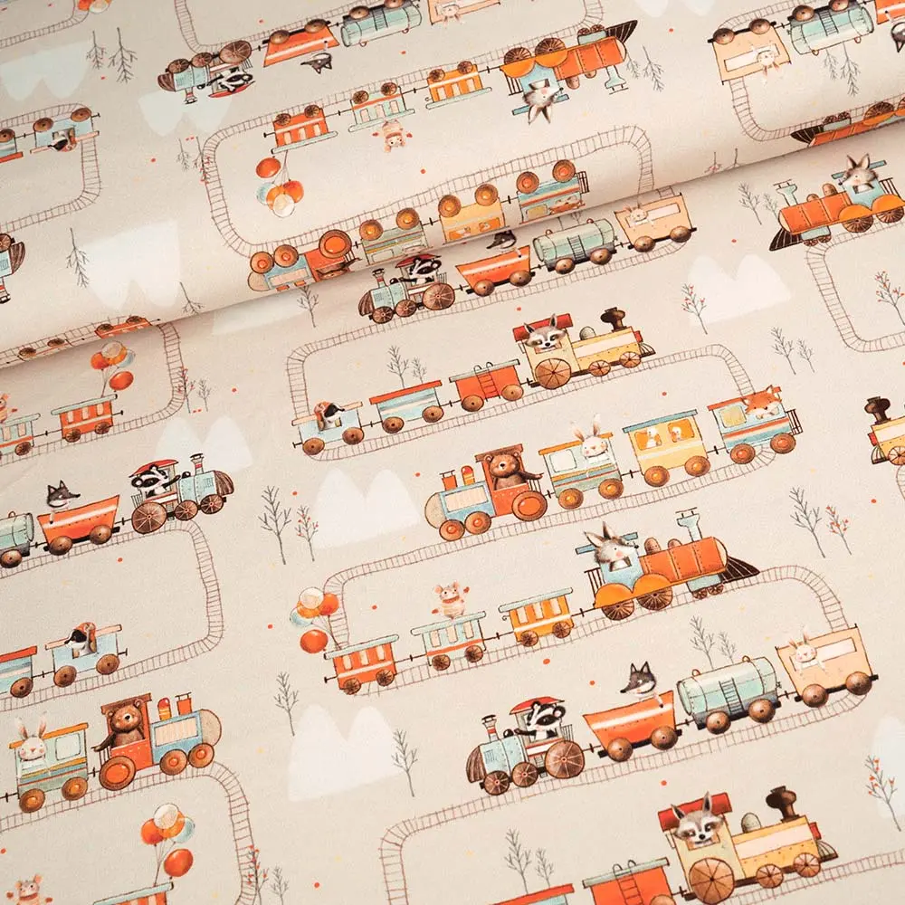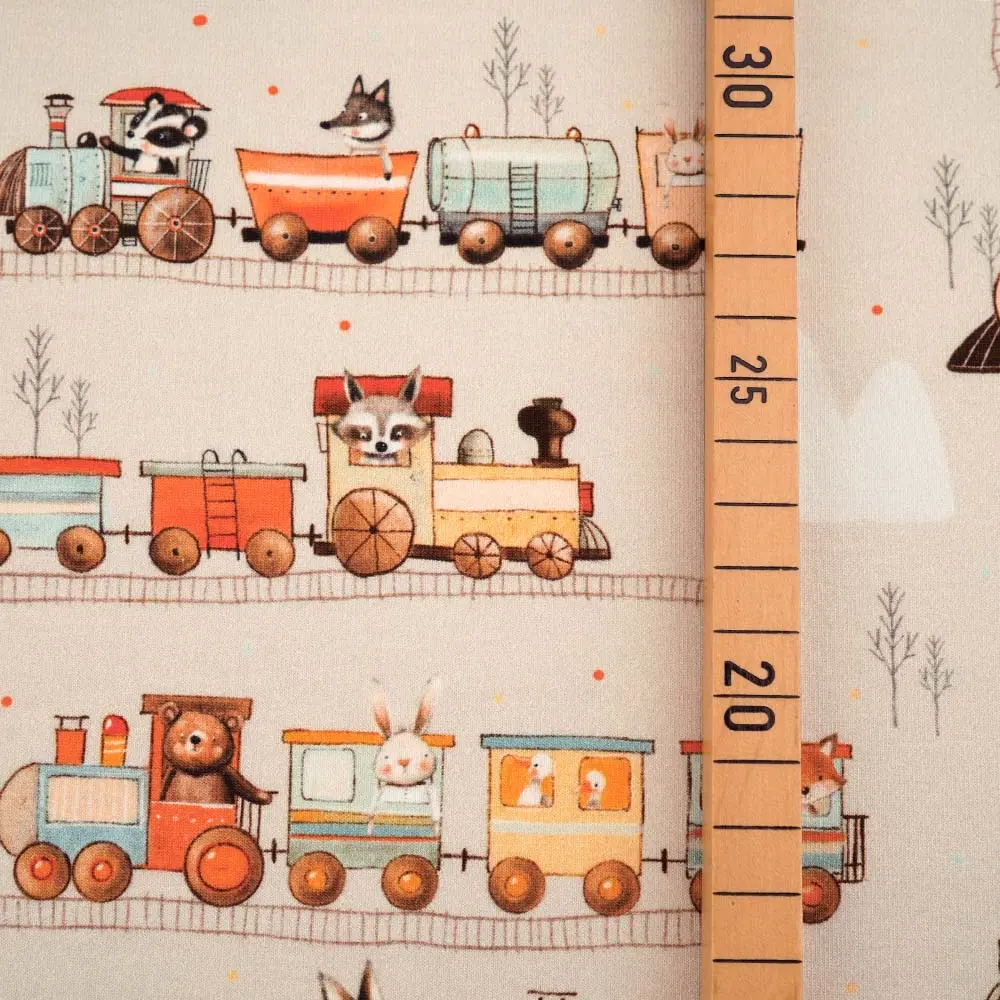 Voller Abenteuer und Charme – der Biojersey "ABENTEUER AUF GLEISEN", entworfen von Eda&Mo, bringt die Welt der Eisenbahnen in jedes Nähprojekt. Das niedliche Design zeigt kleine, tierische Figuren, die fröhlich in ihren Eisenbahnen über die Gleise fahren, in sanften, angenehmen Farben, die Kinderherzen höherschlagen lassen. Hergestellt aus 95% Bio-Baumwolle und 5% Elasthan, überzeugt der Stoff durch seine weiche Haptik und elastische Flexibilität. Perfekt für Kinderkleidung, gemütliche Shirts oder kreative Accessoires, die kleinen Abenteurern gefallen werden. Mit "Gleisbande" holt ihr die spannende Reise auf den Schienen direkt in die Garderobe der Kleinen!