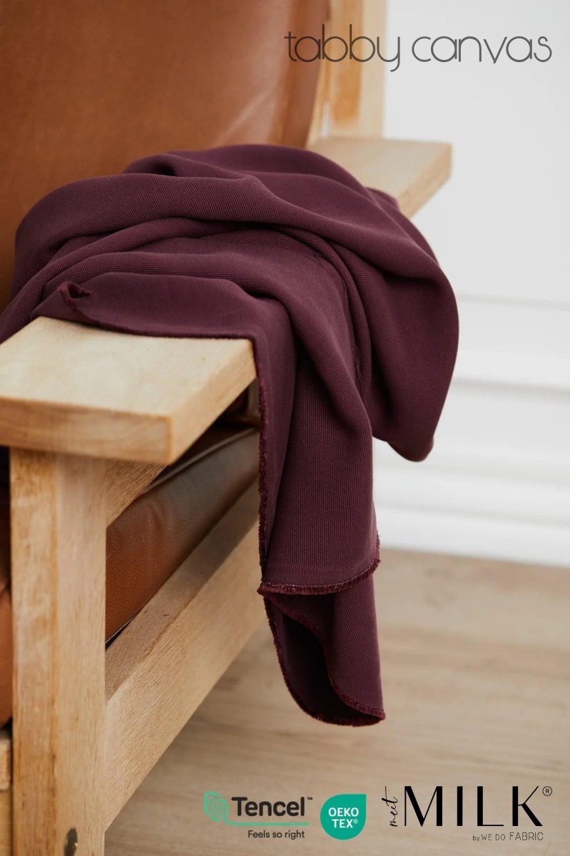 Die Farbe maroon verleiht dem Tabby Canvas von meetMILK eine besonders elegante, tiefrote Note. Die fein strukturierte Canvas-Optik trifft auf den wunderbar weichen, fließenden Griff von TENCEL™ Lyocell – eine Kombination, die sofort hochwertig wirkt und sich unglaublich angenehm trägt. Ideal für lässige Hosen, raffinierte Röcke, schlichte Shirts oder elegante Kleider, die Bewegung und Struktur vereinen sollen.