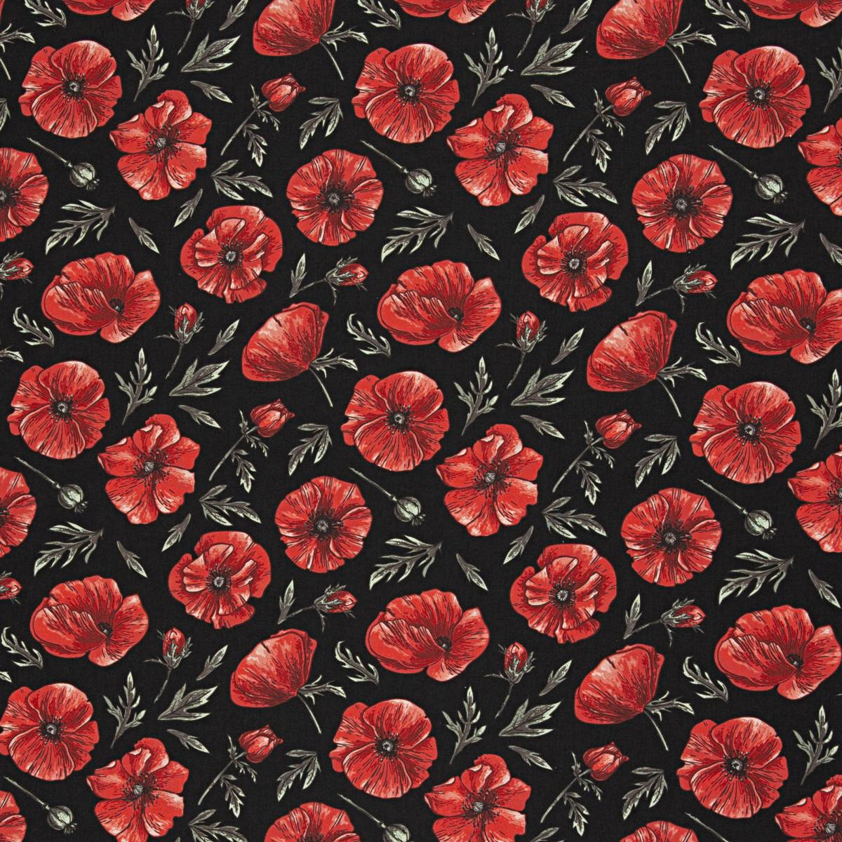 Ein echter Blütentraum aus rotem Mohn - wunderschöner Baumwollstoff aus der Serie Tarrenz von Swafing. Die kräftigen Farben auf schwarzem Untergrund machen diesen Stoff zum perfekten Begleiter für sommerliche Nähprojekte.