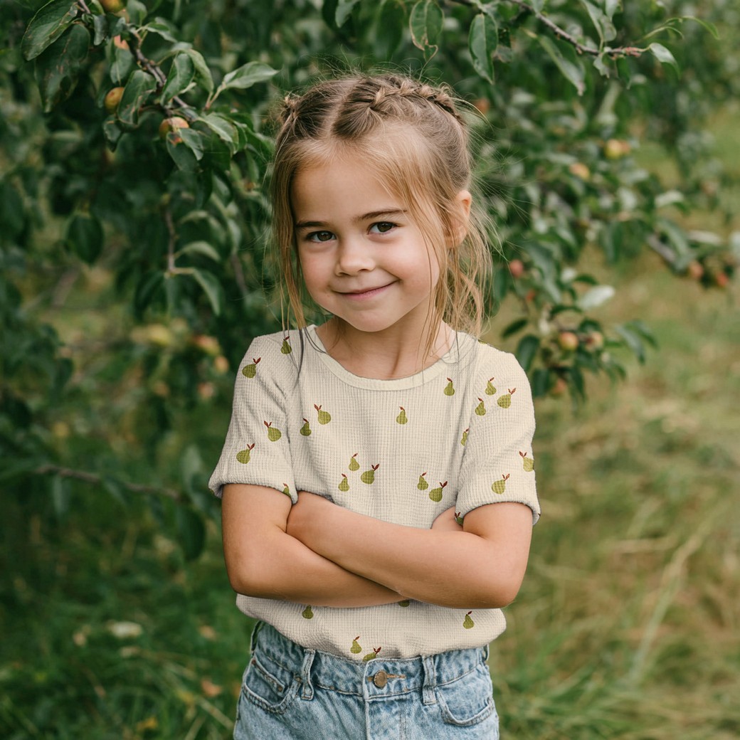 Dieser Waffeljersey in einem warmen Naturton ist mit kleinen grünen Birnen bedruckt und wirkt ruhig, verspielt und zeitlos zugleich. Die typische Waffelstruktur verleiht dem Stoff eine schöne Tiefe und macht ihn besonders angenehm auf der Haut. Mit 95 % Baumwolle und 5 % Elasthan bietet der Stoff eine gute Elastizität und hohen Tragekomfort. Das Gewicht von 210 g/m² macht ihn perfekt für Shirts, Longsleeves, Bodys, Strampler, leichte Kleider oder gemütliche Zweiteiler für Kinder. Auch für lässige Damenshirts ist er bestens geeignet.