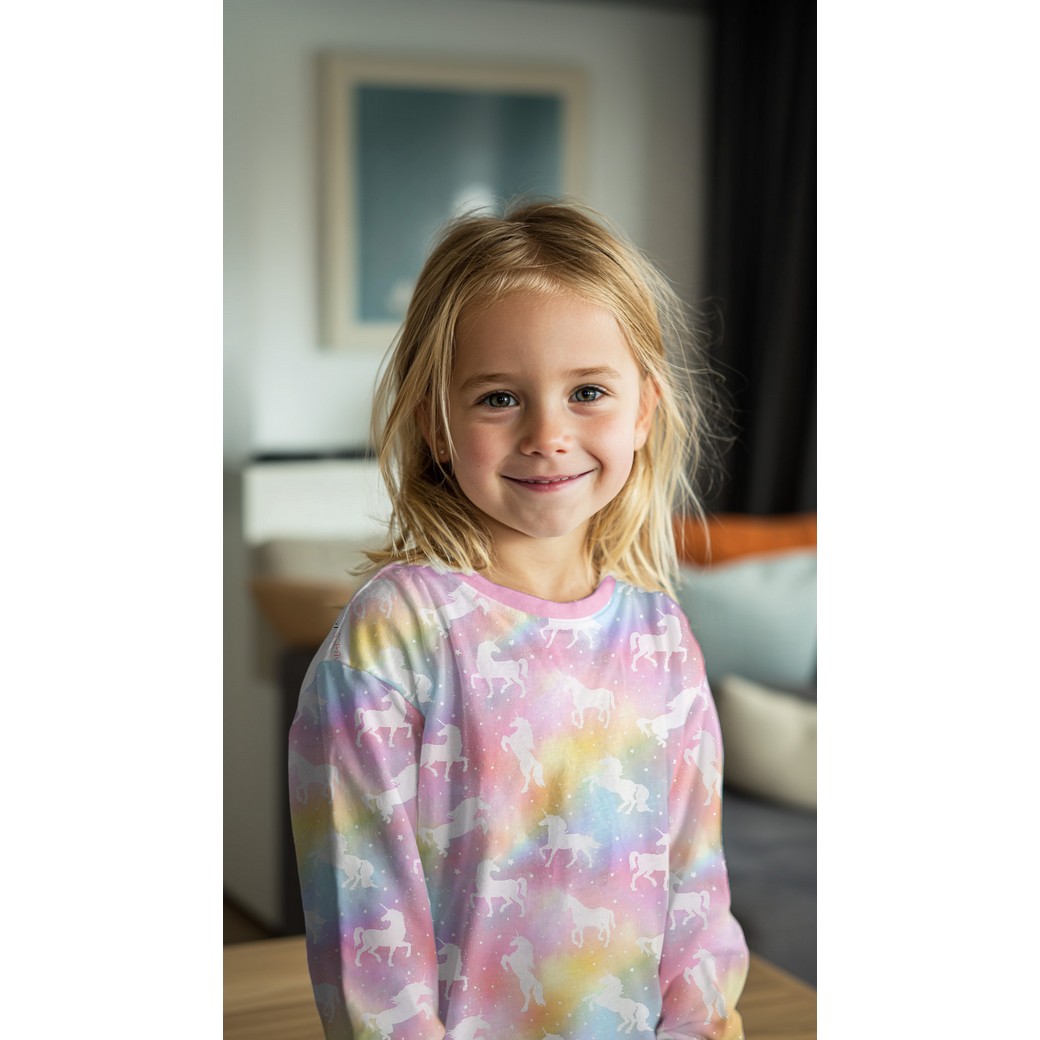 Dieses Design bringt Magie ins Nähzimmer. Weiße Einhörner tanzen über einen zarten Regenbogen-Hintergrund in Pastelltönen – ergänzt durch kleine Sterne für den extra Fantasy-Effekt. Mit 95 % Baumwolle und 5 % Elasthan ist der Jersey angenehm weich, elastisch und alltagstauglich. Das Gewicht von 200 g/m² eignet sich ideal für Shirts, Longsleeves, Kleider, Leggings oder gemütliche Schlafanzüge. Der Stoff trägt sich bequem und macht jede Bewegung mit.