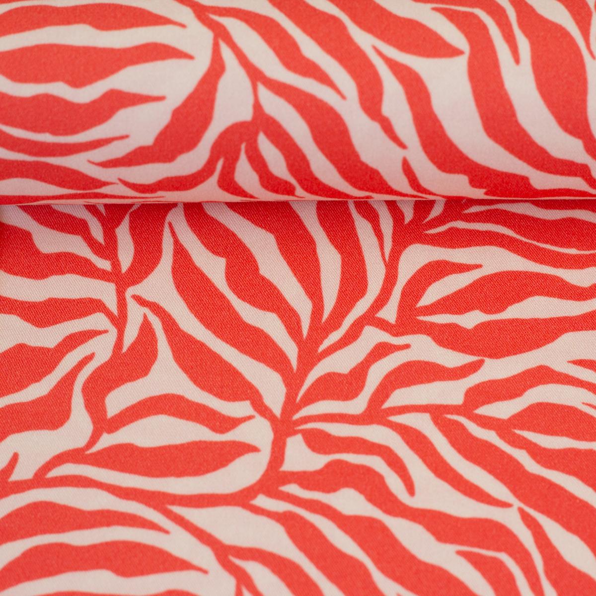 Zebra-Muster in leuchtendem Koralle auf naturfarbenem Hintergrund. Das Design wirkt lebendig, modern und bringt sofort Sommerlaune in jedes Nähprojekt. Die leichte Viskose fällt weich und fließend. Der Stoff trägt sich angenehm kühl auf der Haut und sorgt für schöne Bewegung in Kleidern, Röcken oder Hosen. Ideal für Maxikleider, luftige Sommerkleider, Blusen oder Tops. Auch weite Hosen, Jumpsuits oder Tuniken lassen sich daraus wunderbar nähen. Das lebendige Muster kommt besonders gut bei schlichten Schnitten zur Geltung.