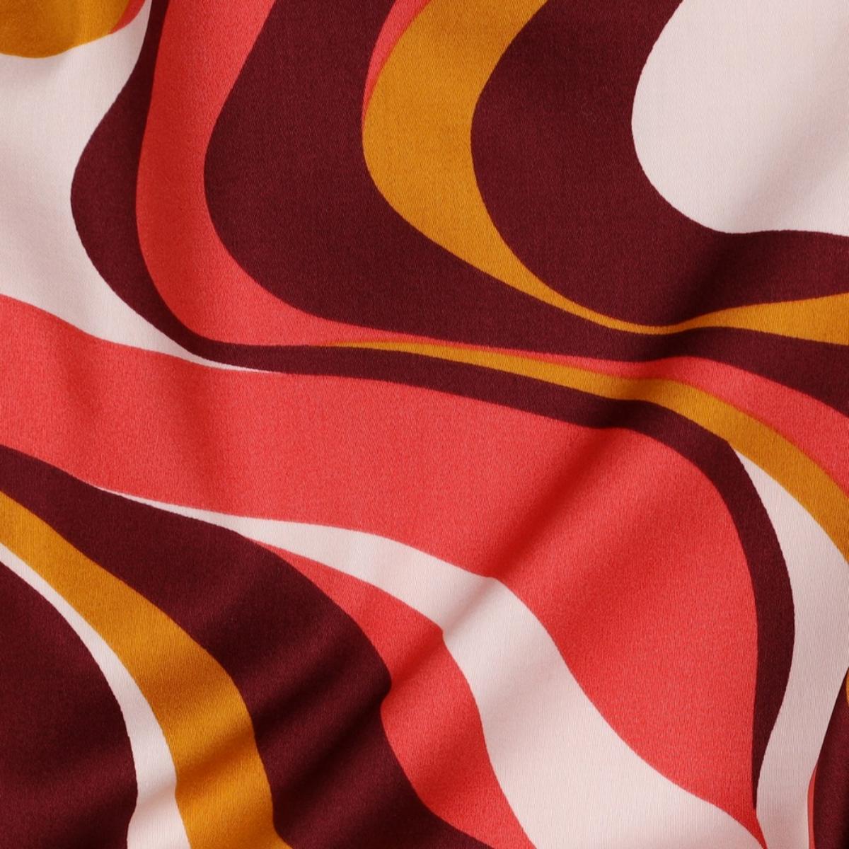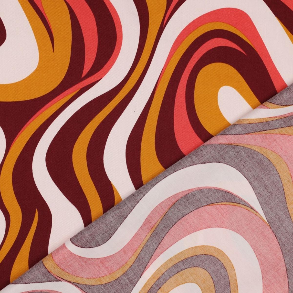 Auffällige Wellen in warmen Tönen wie Rost, Senf und Koralle. Das Design wirkt retro, lebendig und bringt sofort Bewegung ins Projekt. Die glatte Satinbindung sorgt für eine feine Oberfläche mit leichtem Schimmer. Ideal für Blusen, Kleider, Röcke oder leichte Sommerhosen. Auch für Accessoires wie Tücher, Scrunchies oder Taschenfutter passt der Stoff gut. Im Deko-Bereich macht er sich stark als Kissen, Vorhang oder Eyecatcher im Raum.