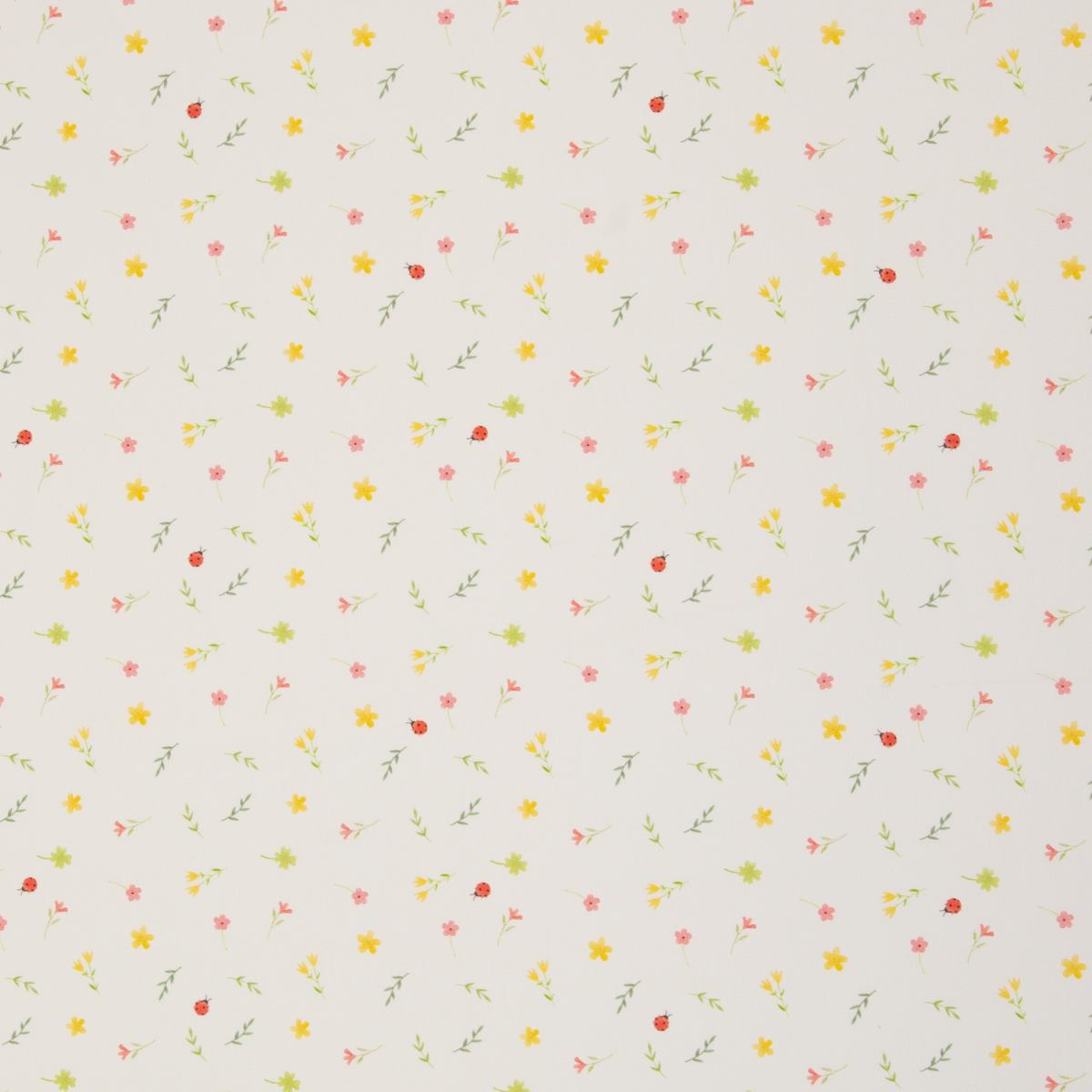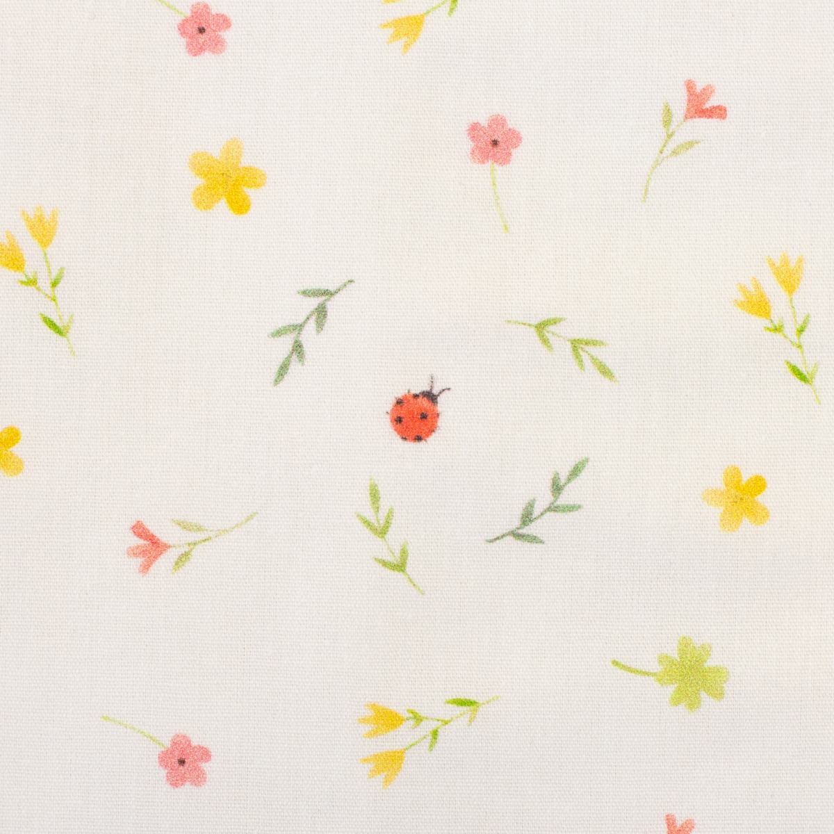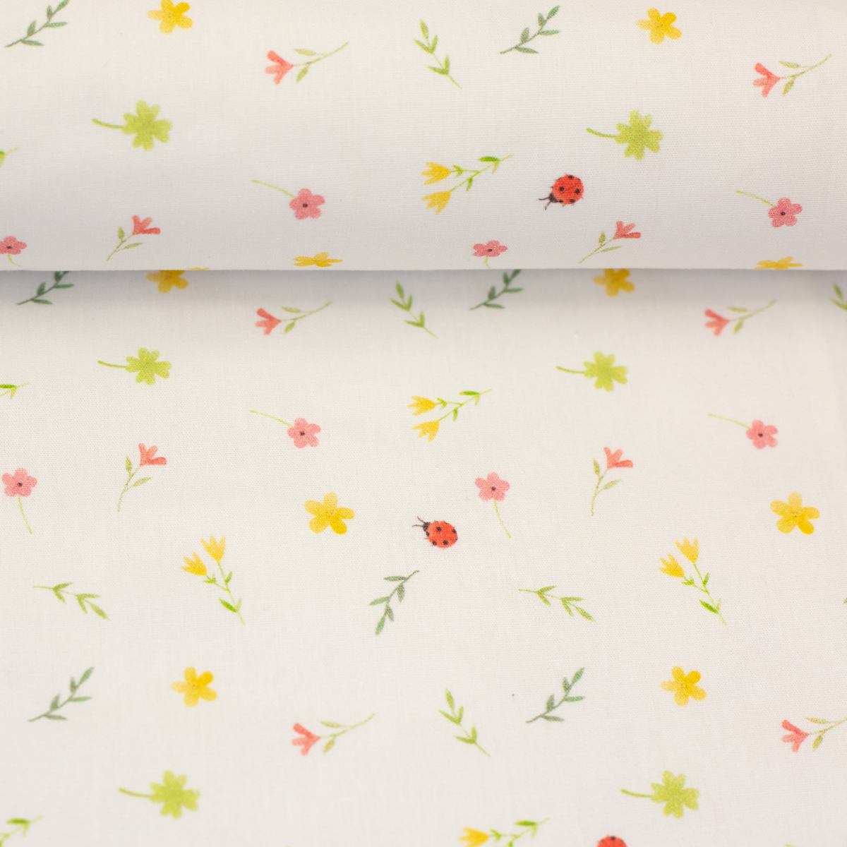 Diese feine Baumwolle in Offwhite ist mit kleinen Blümchen, zarten Zweigen und niedlichen Marienkäfern bedruckt. Das Muster wirkt leicht, verspielt und freundlich und passt wunderbar zu fröhlichen Nähprojekten für Groß und Klein.