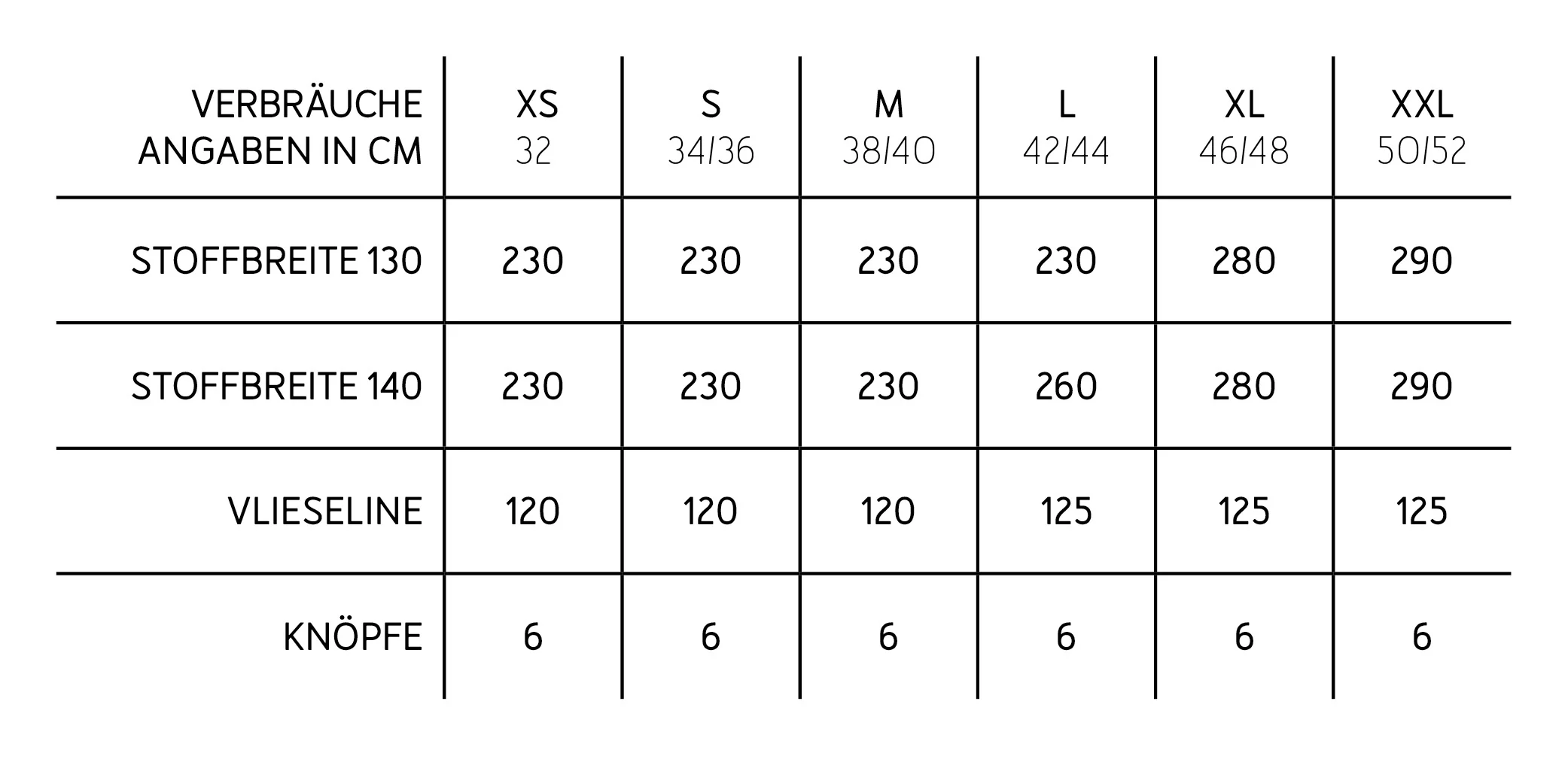 • Materialempfehlung: weich fallende Webwaren wie z.B. Viskoseleinen, Viskose, Musselin oder Tencel
