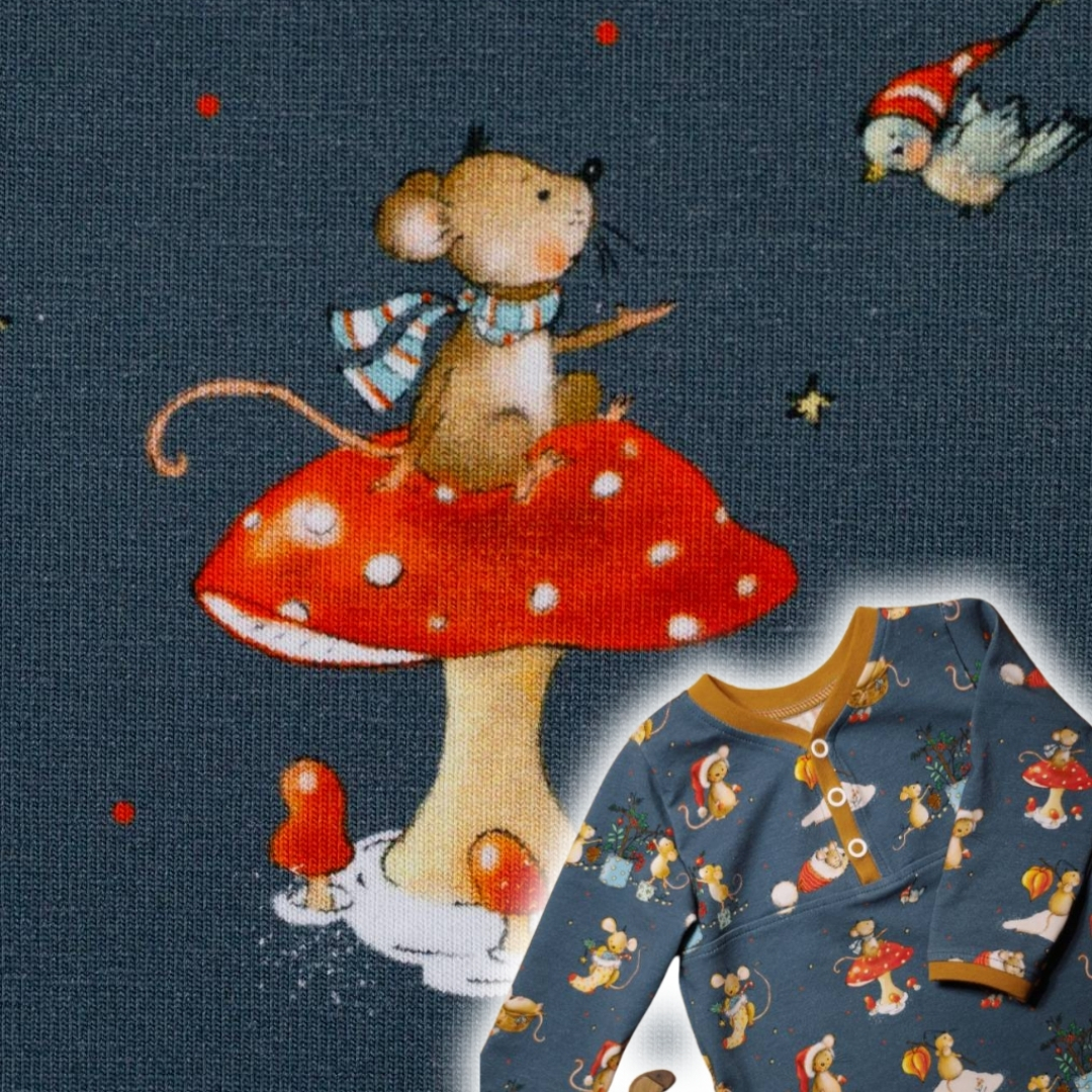 Weiterführende Links zu "Jersey Weihnachten Maus Fliegenpilz dunkelblau - Baumwolljersey Serhie Lathi von Swafing"