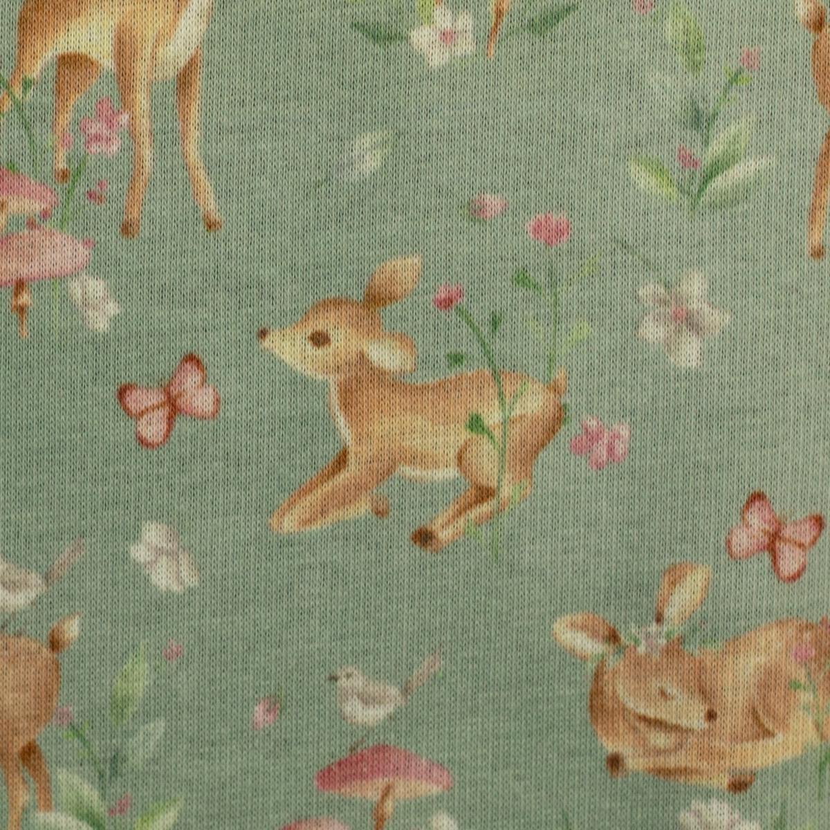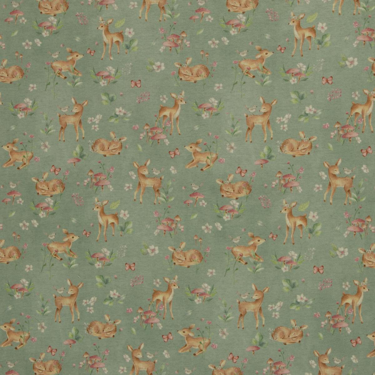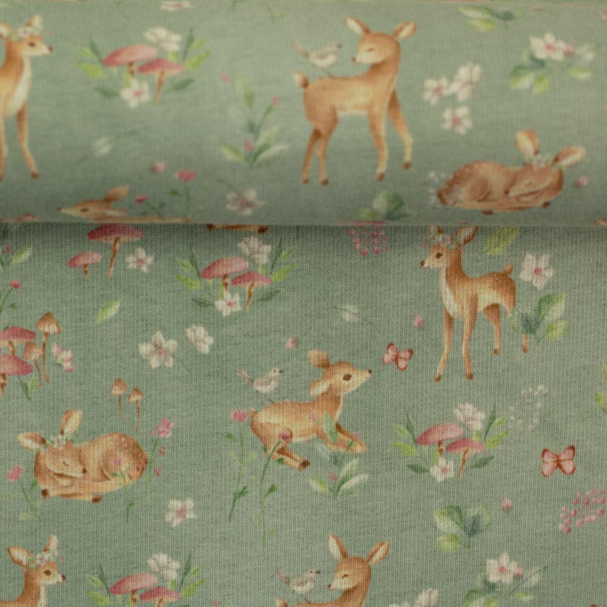 Zauberhaftes Design und Kuschelkomfort! Der Alpenfleece Isla von Swafing - kleine Rehe zwischen Blüten, Pilzen und Schmetterlingen – ein echter Hingucker für große und kleine Naturliebhaber. Die Rückseite aus weichem Fleece sorgt für wohlige Wärme und macht den Stoff ideal für Pullis, Hoodies, Jacken, Beanies, Loops oder Babydecken. Ein Stoff zum Reinkuscheln!