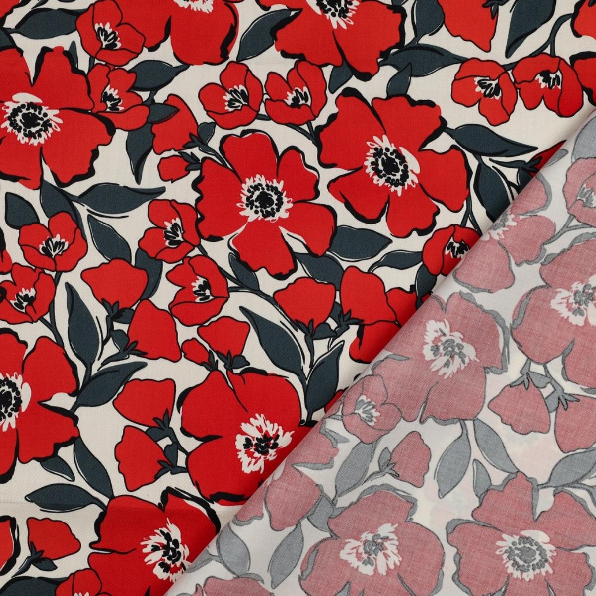 Große, ausdrucksstarke Blüten in kräftigem Rot treffen auf einen ruhigen, cremefarbenen Hintergrund. Das Design wirkt klassisch, feminin und gleichzeitig modern. Die glatte Satinbindung sorgt für eine weiche Haptik mit leichtem Schimmer. Perfekt für Kleider, Blusen, Röcke oder leichte Sommerhosen. Auch für Tücher, Scrunchies oder als edles Futter in Taschen ein schöner Hingucker.