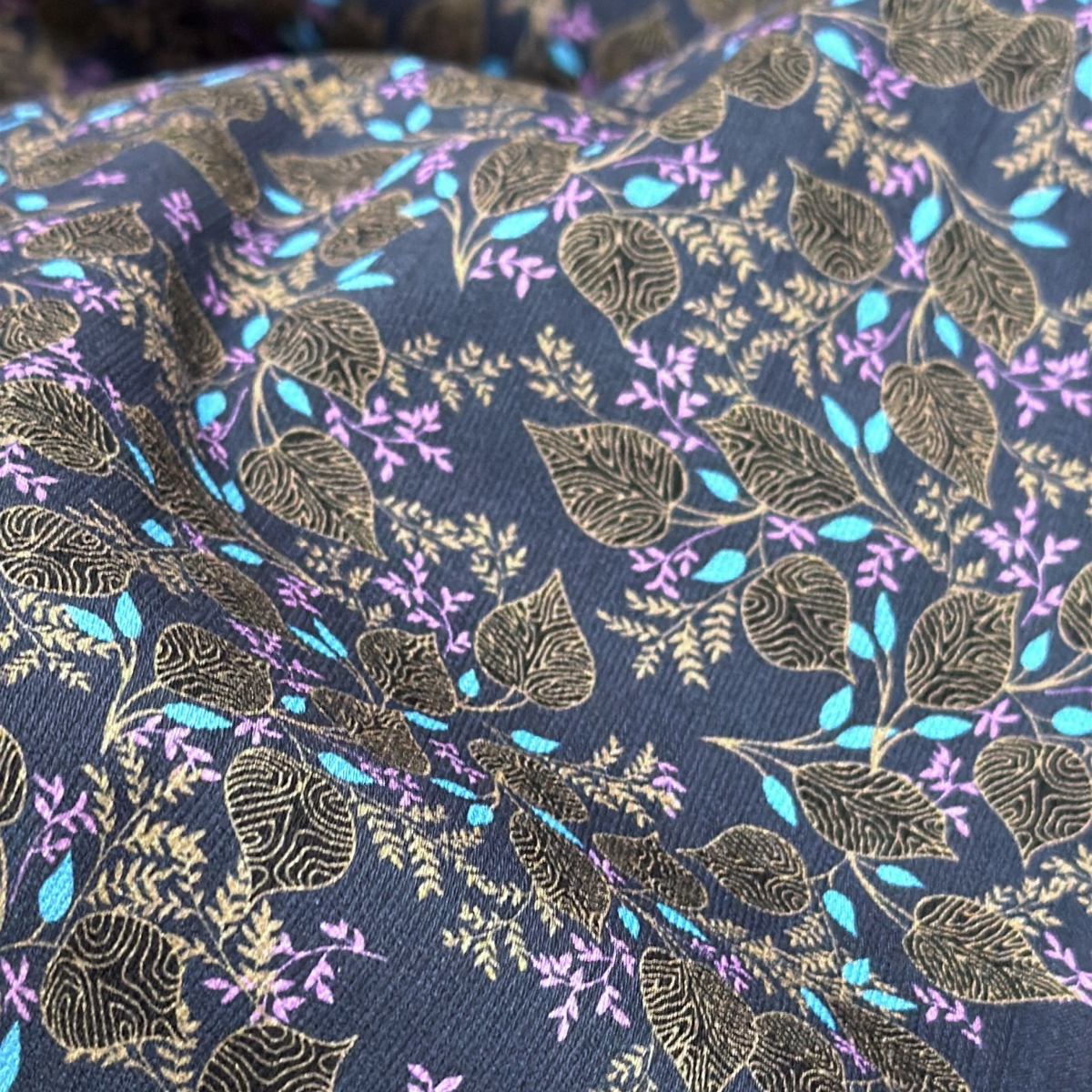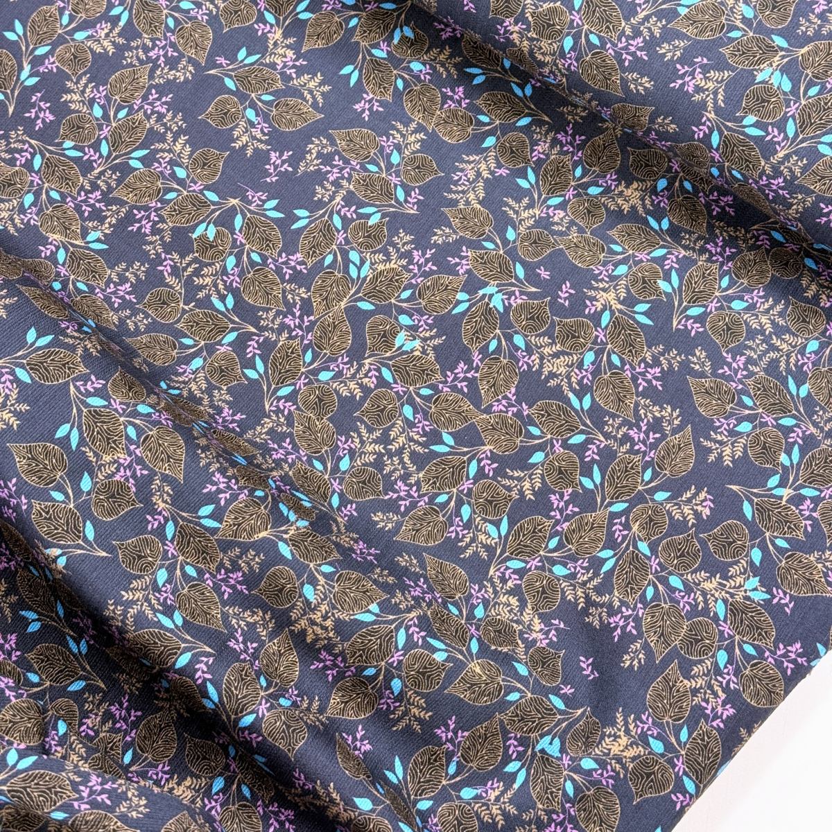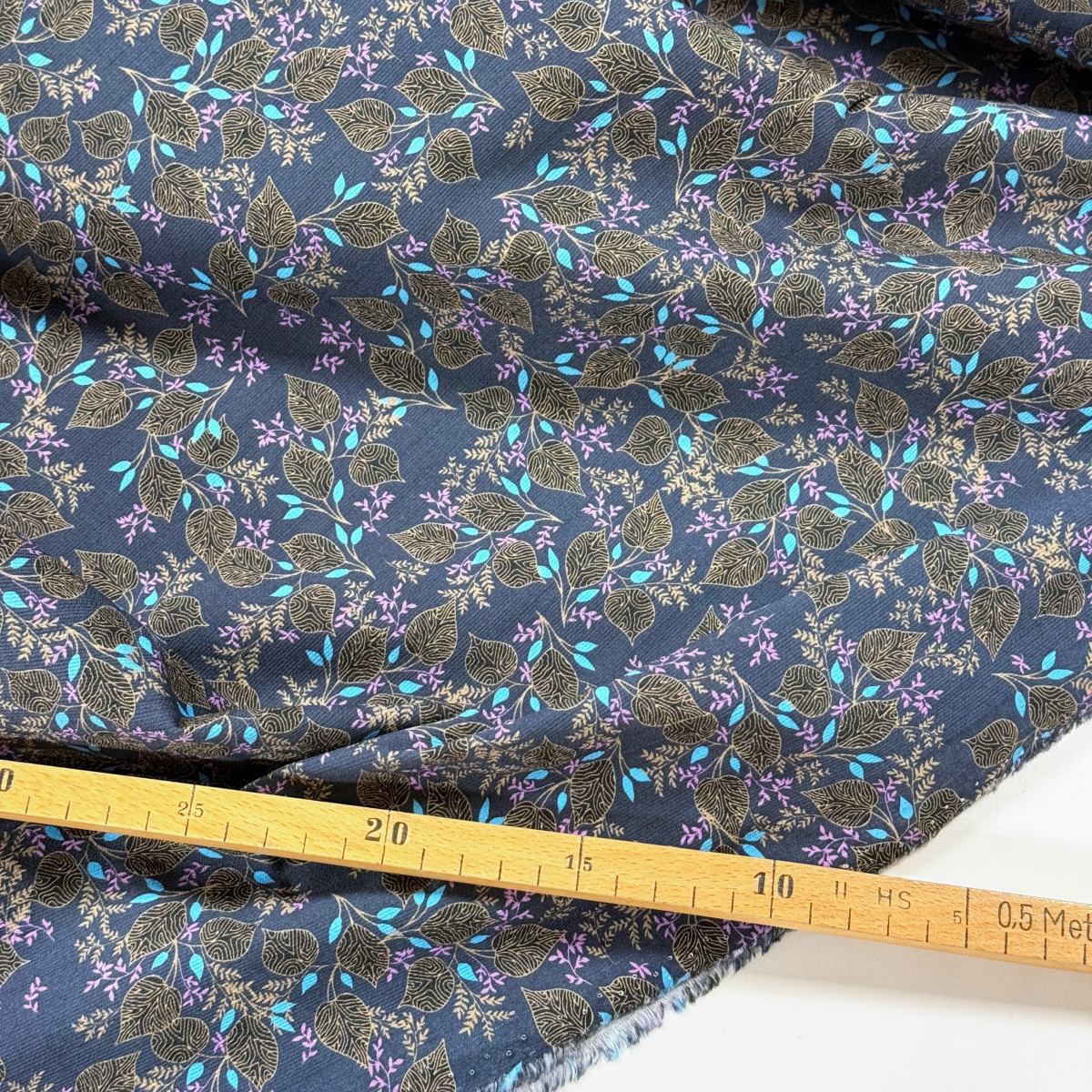 Dieser Feincord hat einen graublauen Hintergrund und ist mit feinen Blätterranken in gedeckten Naturtönen, Türkis, gold und Lila bedruckt. Das Muster wirkt ruhig, besonders und ein bisschen verspielt, ohne zu süß zu sein. Durch die feine Cordstruktur bekommt der Stoff zusätzlich Tiefe und eine schöne Oberfläche.