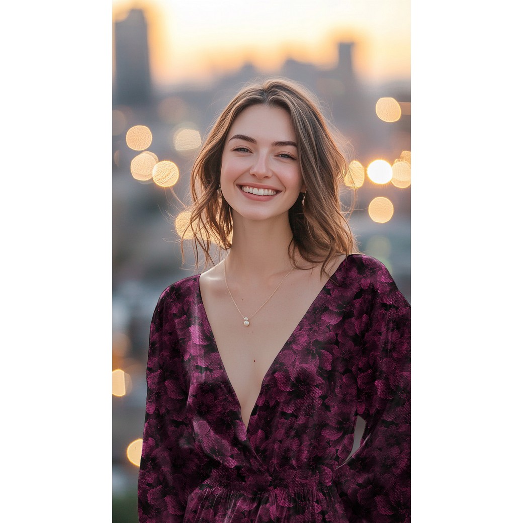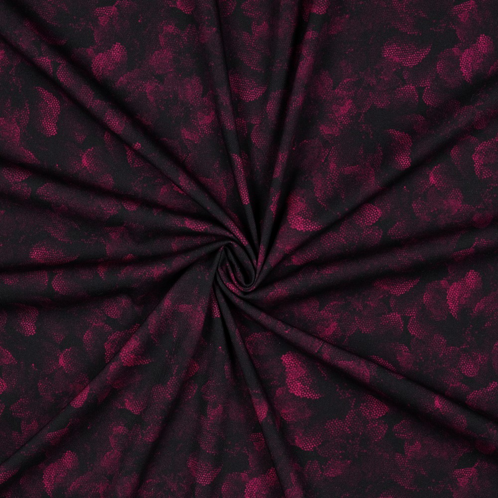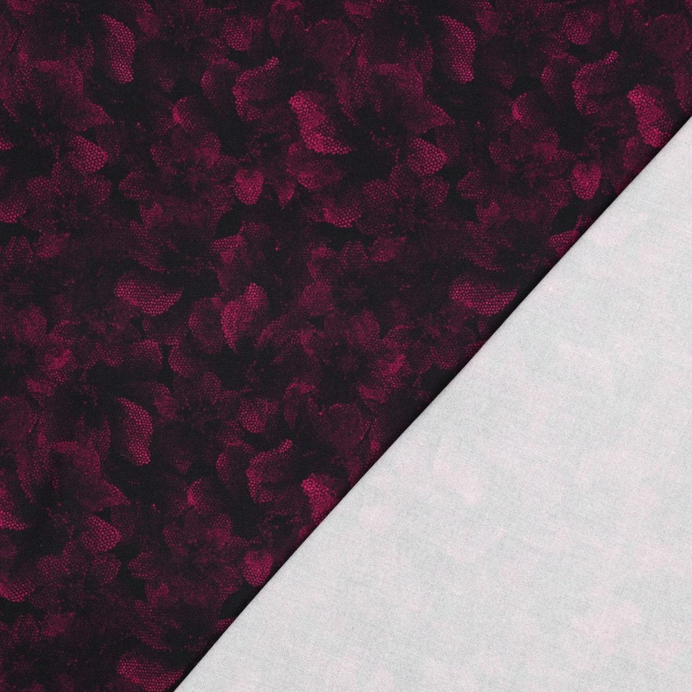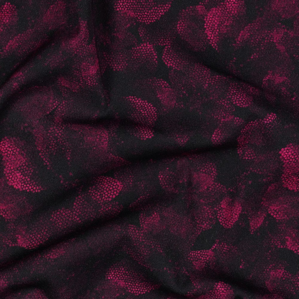 Rosella in Fuchsia - ausdrucksstarkes, florales Design auf dunklem Grund. Die kräftigen Beerentöne wirken edel und lebendig zugleich – perfekt für besondere Alltagslooks oder elegante Lieblingsstücke.