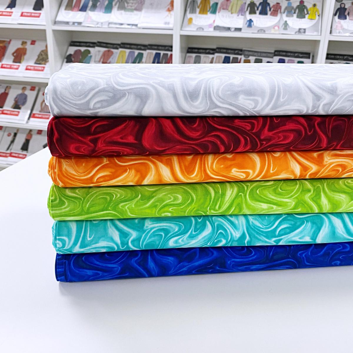 Die Serie Marbleized von Greta Lynn bringt Farbe und Bewegung in dein Nähzimmer! Die Baumwollstoffe haben ein einzigartiges marmoriertes Design, das jedem Projekt eine spannende Tiefe verleiht.