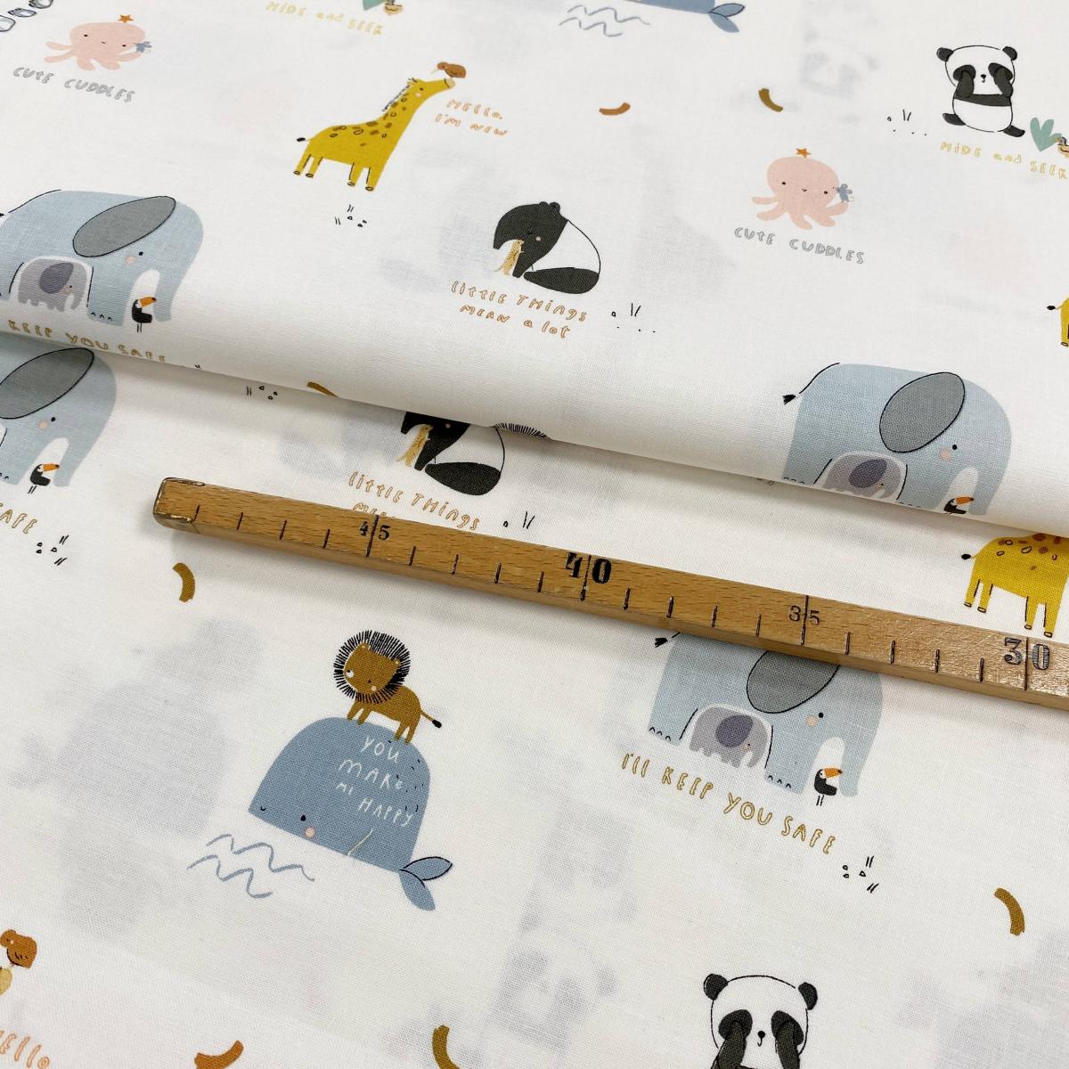 Einfach bezaubernd! Elefanten, Pandas, Wale, Giraffen und kleine Sprüche wie „Hide and Seek“ oder „You make me happy“ verleihen diesem Stoff einen wunderbar zarten Look. Perfekt für Babydecken, Wickelunterlagen, Utensilos, Kissen oder süße Kinderkleidung. Kombiniere ihn mit den passenden Mustern der Serie für ein stimmiges Gesamtbild.