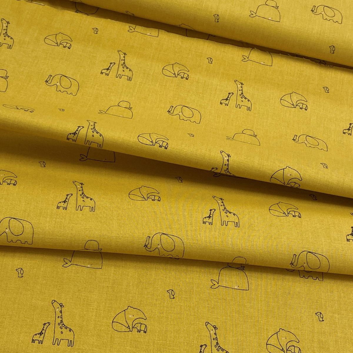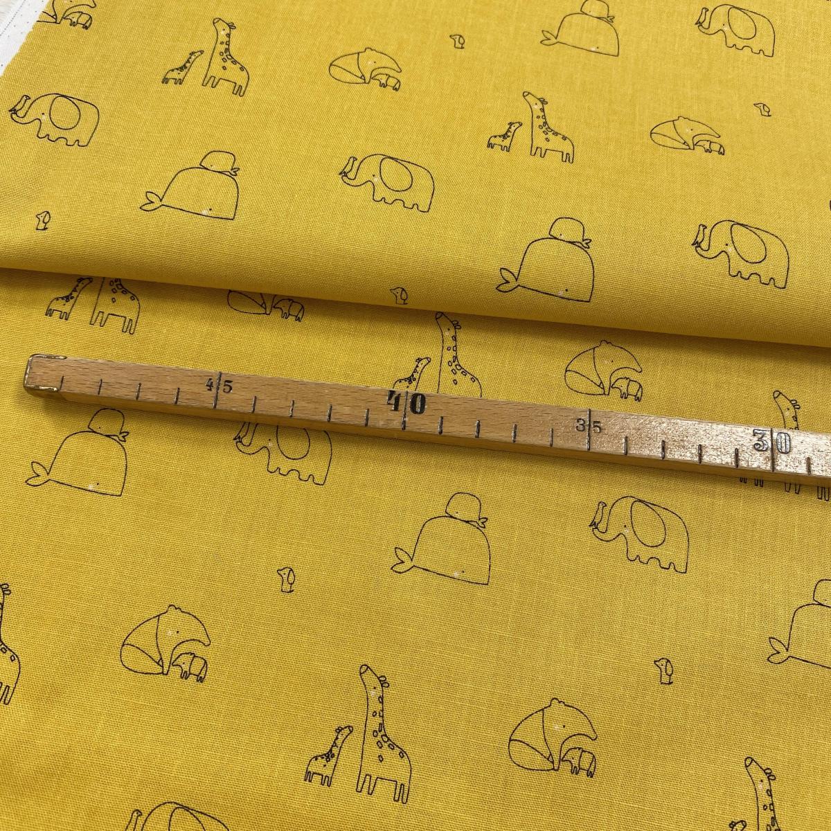 Auf dem warmen Senfton tummeln sich filigrane Linienzeichnungen von Elefanten, Giraffen, Walen und Bären – dezent, aber voller Charme. Der perfekte Kombistoff zu den kindlich-verspielten Hauptmotiven der Serie Little Things. Ideal für Kissen, Quilts, Utensilos oder Babyaccessoires, die ein wenig Farbe und Wärme vertragen dürfen.