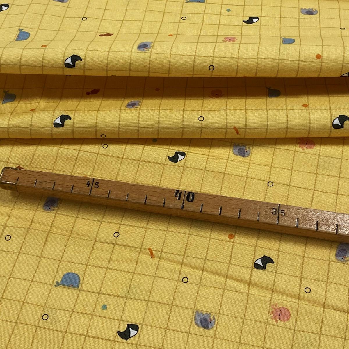 Dieser Stoff bringt Sonne ins Nähzimmer! Auf einem zarten Gittermuster tummeln sich kleine Wale, Oktopusse und andere Tierfreunde – perfekt für Kinderaccessoires, Babydecken, Kissen oder Patchwork. Die harmonischen Gelb- und Blautöne passen wunderbar zu den anderen Stoffen der Serie Little Things.