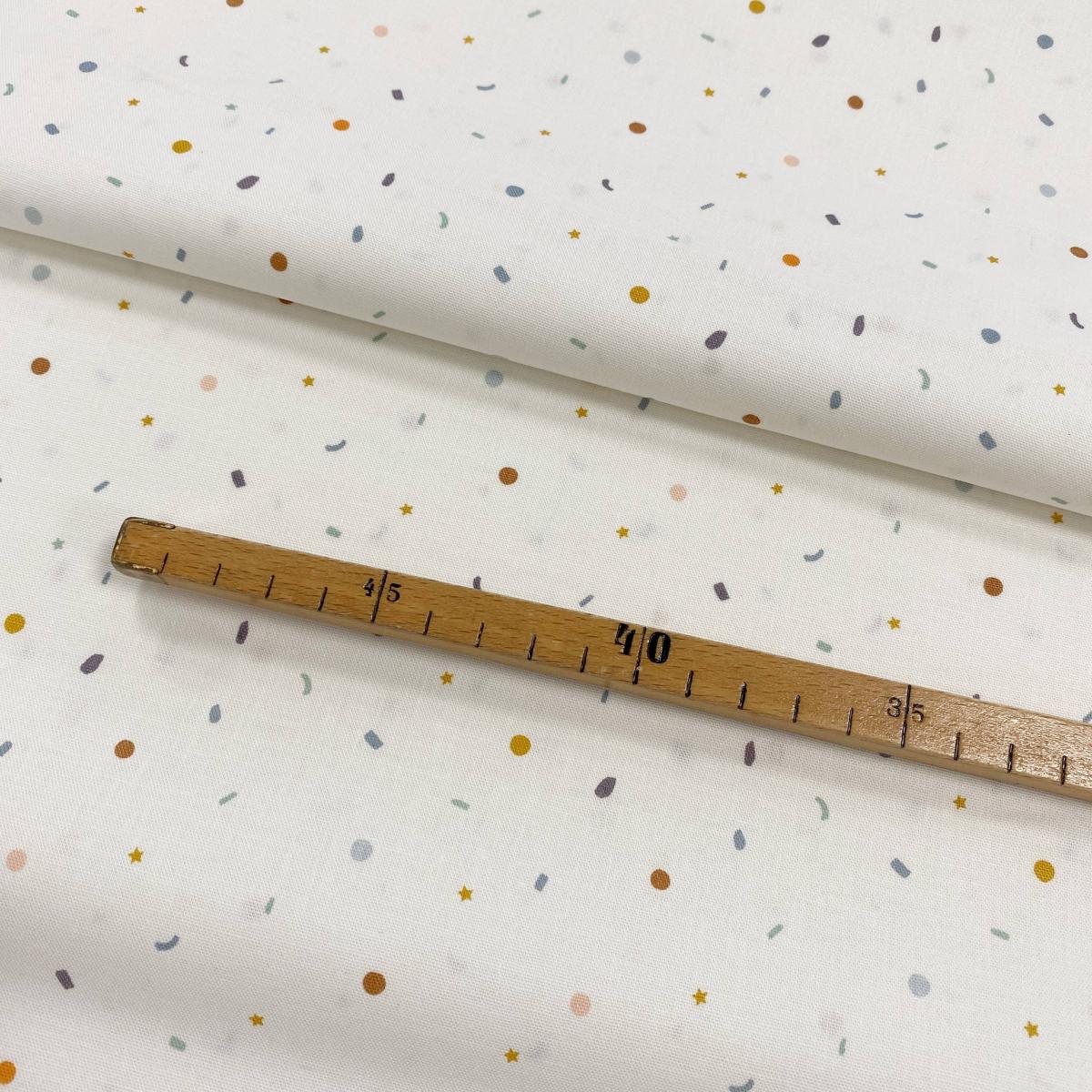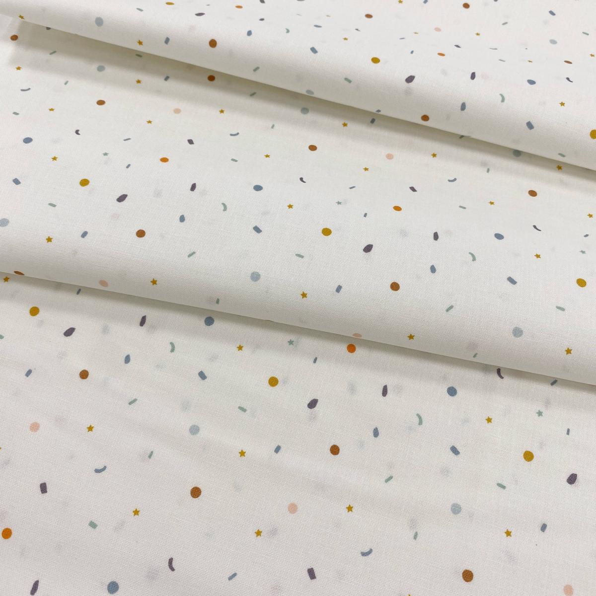 Kleine Punkte, Sterne und Striche tanzen über diesen zarten Baumwollstoff wie Konfetti – ein fröhliches Design, das sofort gute Laune macht. Ideal für Babydecken, Stoffkörbchen, Kissen oder bunte Quilts. Auch als Kombistoff zu den anderen Designs der Serie Little Things macht er eine tolle Figur.