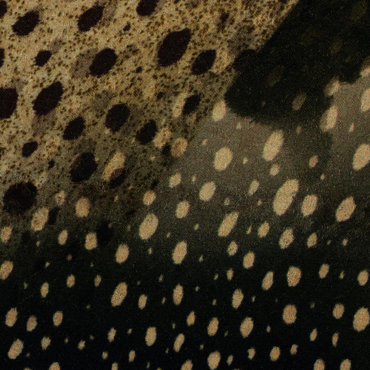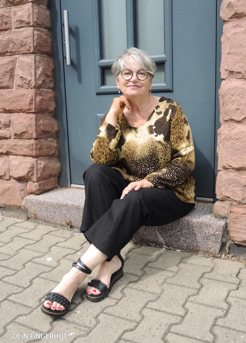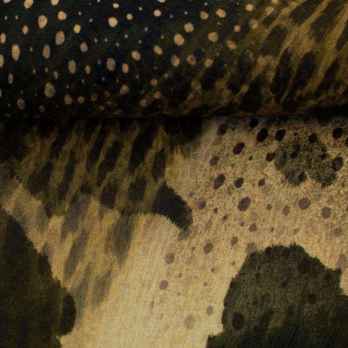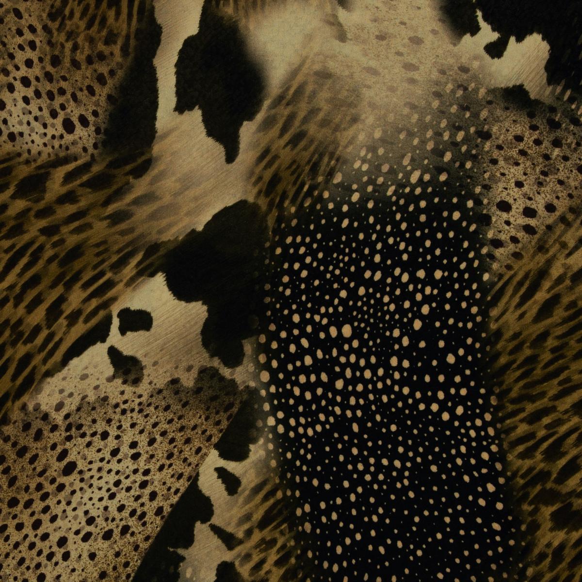 Großflächiger Animalprint trifft auf feine Punkte und warme Naturtöne. Braun, Schwarz und Beige wirken edel und ruhig zugleich. Der Stoff fällt weich, liegt angenehm auf der Haut und bringt Bewegung ins Design. Perfekt für Blusen, Tuniken, leichte Shirts oder fließende Kleider. Auch weite Hosen oder Röcke bekommen mit diesem Print einen modernen, selbstbewussten Look. Durch das geringe Gewicht eignet sich die Viskose besonders gut für luftige Schnitte mit Fall und Weite.