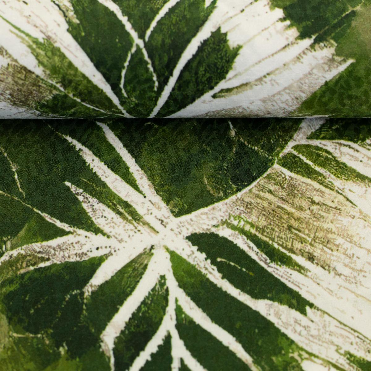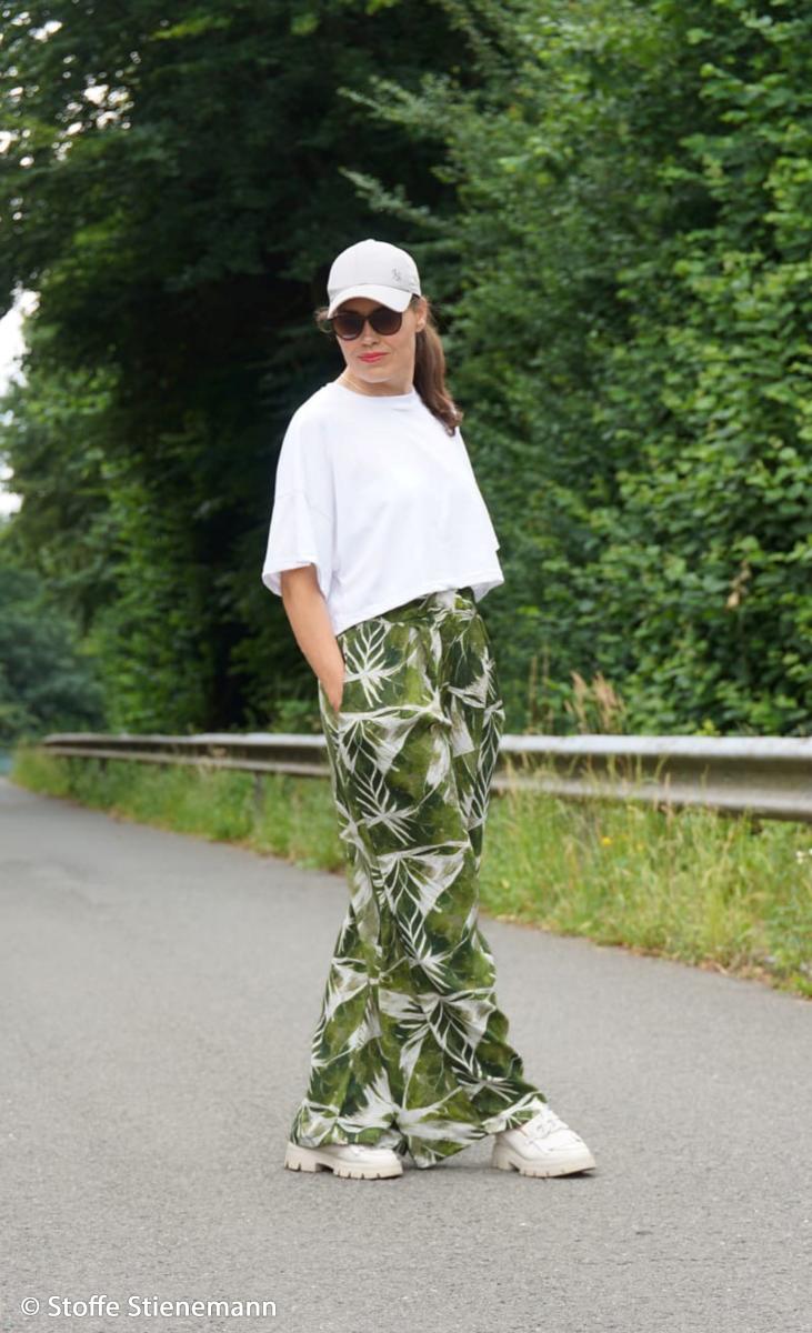 Große, grafische Blätter in verschiedenen Grüntönen treffen auf einen hellen Kontrast. Das Design wirkt frisch, modern und trotzdem ruhig. Der Stoff fällt fließend und sorgt für eine schöne Silhouette mit Bewegung. Ideal für weite Hosen, Culottes, luftige Blusen, Tuniken oder Sommerkleider. Auch Zweiteiler mit weiter Hose und schlichtem Shirt wirken mit diesem Print besonders stark. Durch das geringe Gewicht trägt sich die Viskose leicht und angenehm – perfekt für wärmere Tage.