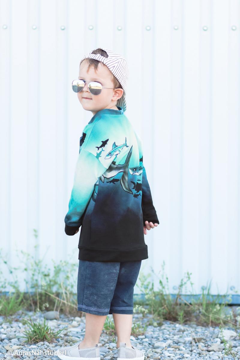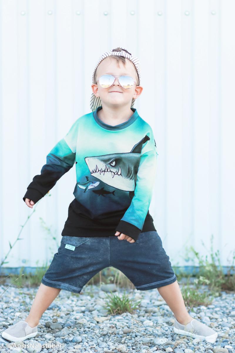 Dieses French Terry Panel Shark Tank bringt echtes Meeres-Feeling ins Nähzimmer. Das kraftvolle Design von Thorsten Berger zeigt imposante Haie vor tiefem Türkis-Blau und sorgt für einen starken, sportlichen Look – ideal für kleine und große Abenteurer. Das Panel misst ca. 85 x 150 cm und eignet sich hervorragend für Hoodies, Sweater, Longshirts oder Kleider mit Statement-Front. Auch als Vorderteil für ein cooles Shirt oder kombiniert mit unifarbenem French Terry wirkt das Motiv besonders stark. Durch den Elasthan-Anteil ist der Stoff angenehm elastisch und bequem zu tragen – perfekt für aktive Kids. Der Farbverlauf endet in einem schwarz - unser schwarzer French Terry ist der perfekte Kombistoff und unter dem Artikel für euch verlinkt.