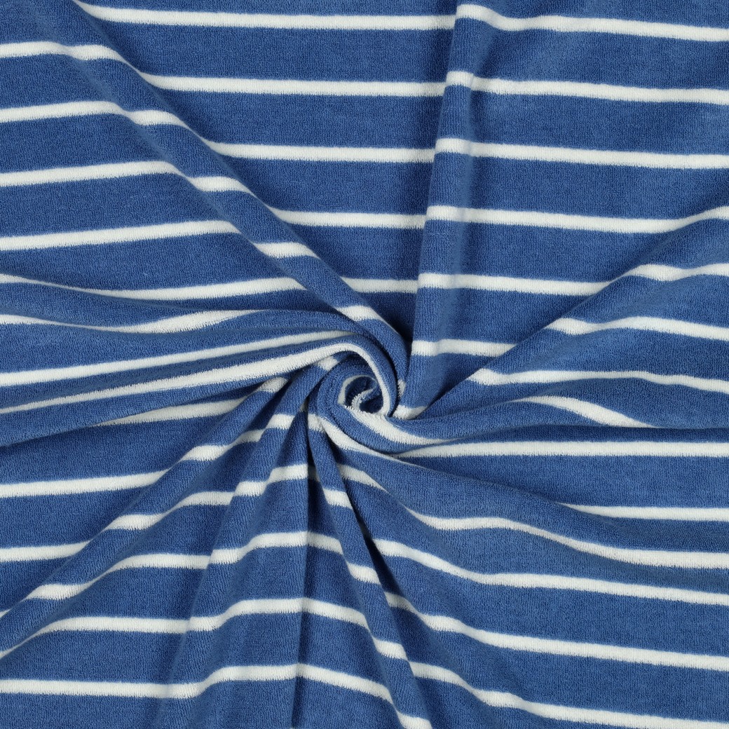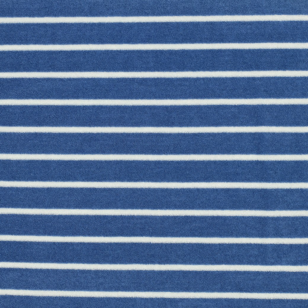 Leichter Baumwollfrottee mit klassischen Streifen in Blau und Weiß. Die Oberfläche ist weich, angenehm auf der Haut und typisch flauschig durch die feinen Schlingen. Durch das garngefärbte Streifendesign wirkt der Stoff hochwertig und zeitlos.