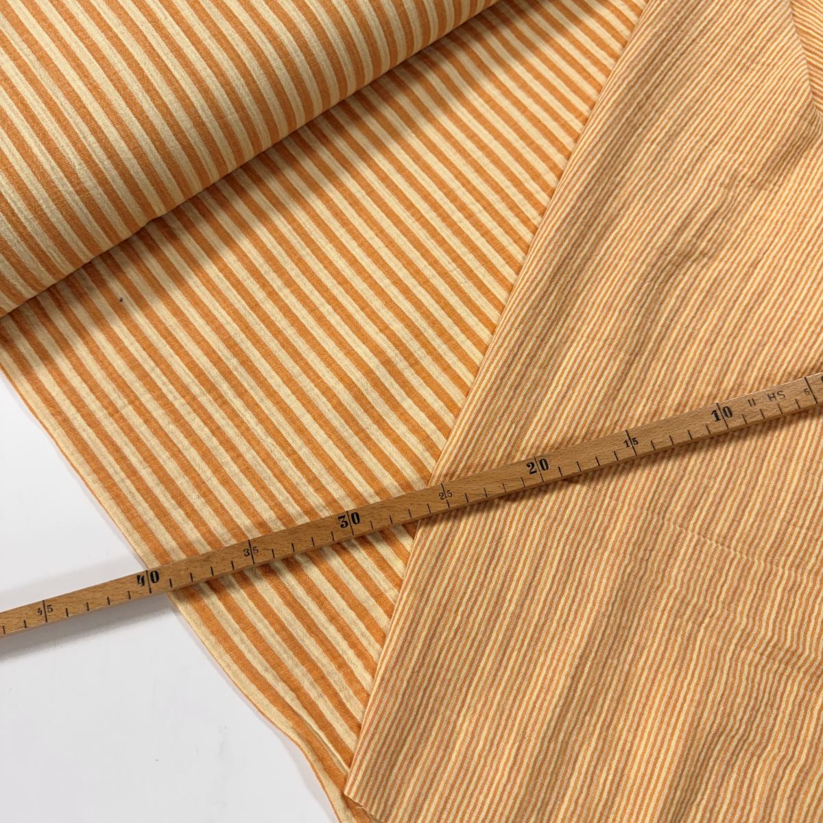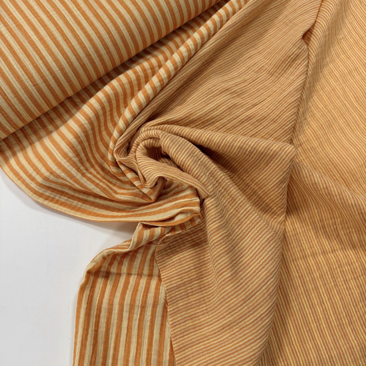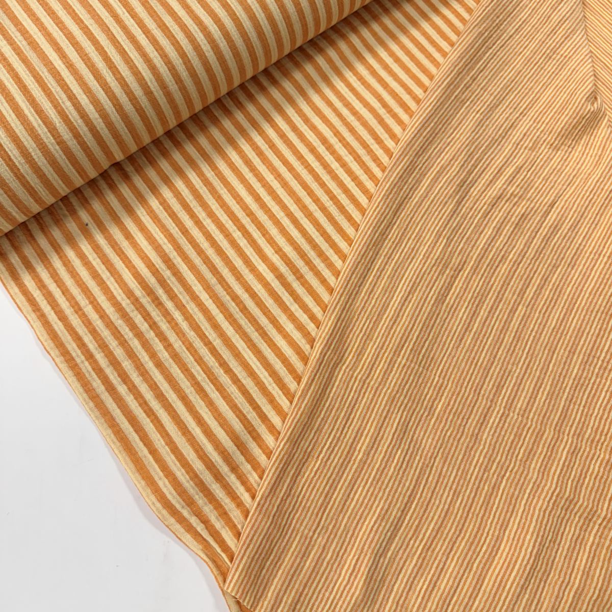 Dieser Doubleface Musselin in Ringelblumen Gelb bringt gleich zwei Streifenvarianten mit. Eine Stoffseite ist schmal gestreift, die andere zeigt breitere Streifen – so kannst du beim Nähen wunderbar mit Kontrasten spielen. Der warme Gelbton wirkt freundlich, frisch und sommerlich.
