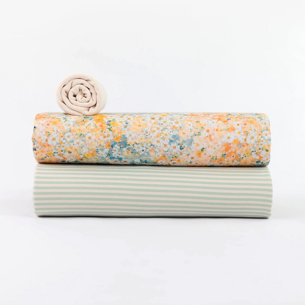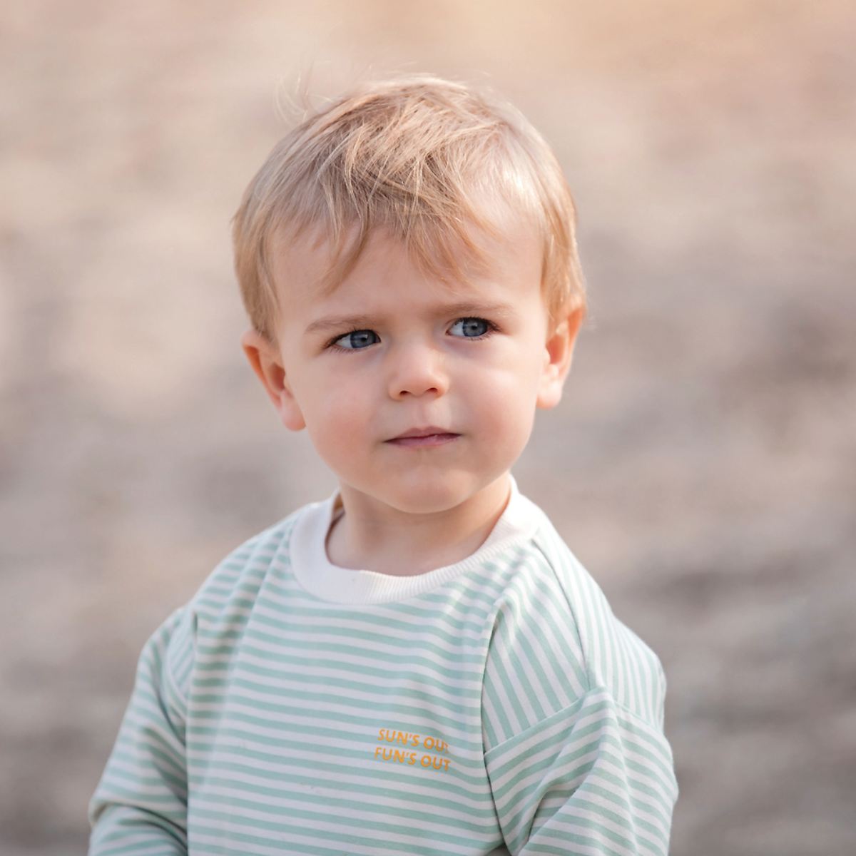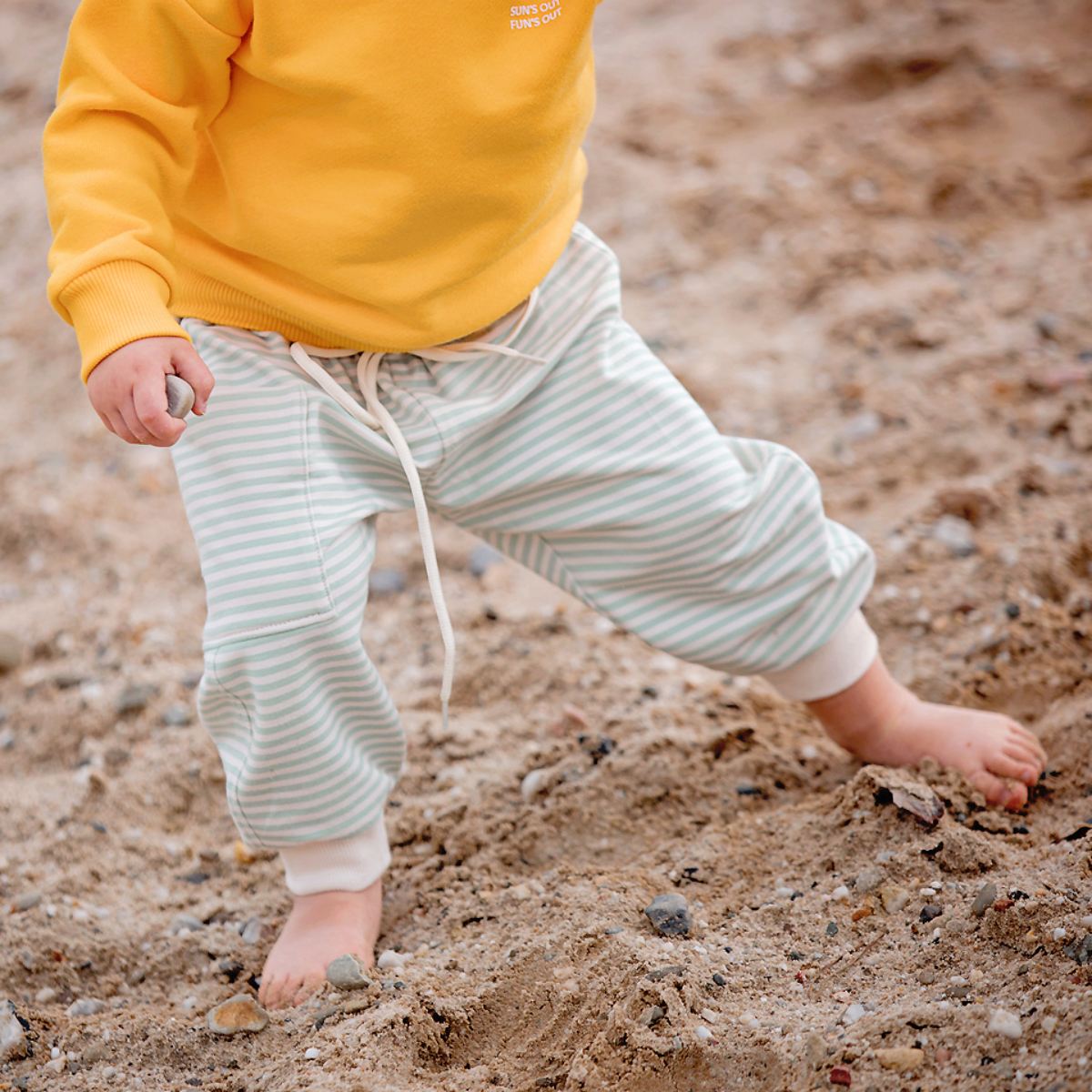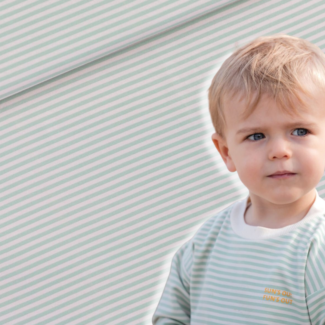 Feine 5 mm Streifen in Flüsterbeige und Zartgrün ergeben einen ruhigen, frischen Look – zeitlos, aber nicht langweilig. Die zarte Mintnote bringt Leichtigkeit, das Creme sorgt für Wärme. Eine Kombination, die besonders bei Kinder- und Loungewear wirkt, aber ebenso für cleane Erwachsenenteile geeignet ist. Der French Terry fühlt sich weich an, ist angenehm dehnbar – sowohl horizontal als auch vertikal – und bietet dadurch hohen Tragekomfort. Mit 250 g/m² ist er mittelschwer und perfekt für Sweatshirts, Hoodies, Jogger, Jacken oder gemütliche Sets.